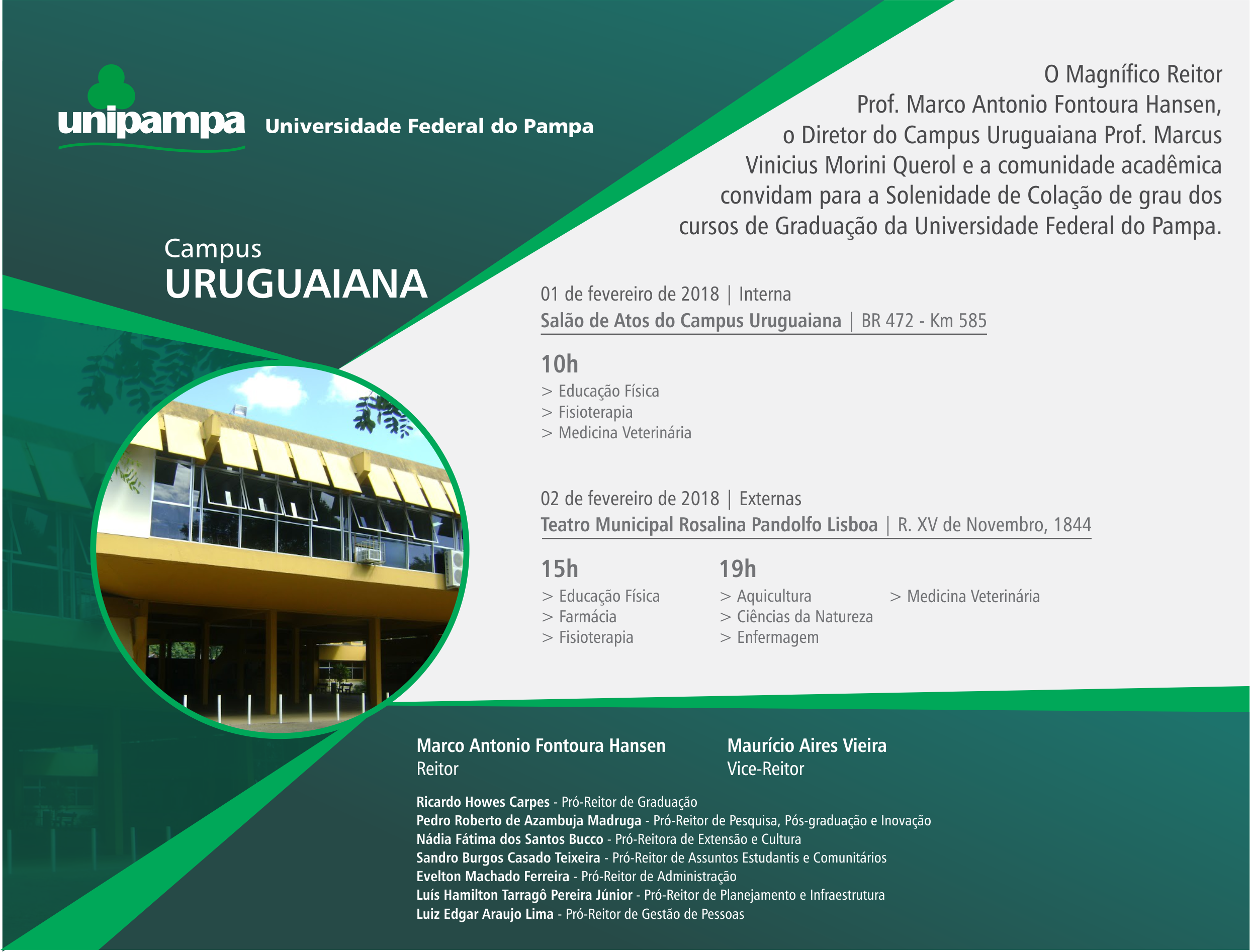Ementa: PROT. 017/2018 - UNIPAMPA CONVIDA PARA A SOLENIDADE DE COLAÇÃO DE GRAU DOS CURSOS DE GRADUAÇÃO. DIA 01.02, NO SALÃO DE ATOS DO CAMPUS URUGUAIANA, ÀS 10H. E DIA 02.02, NO TEATRO MUNICIPAL, ÀS 15H E 19H.