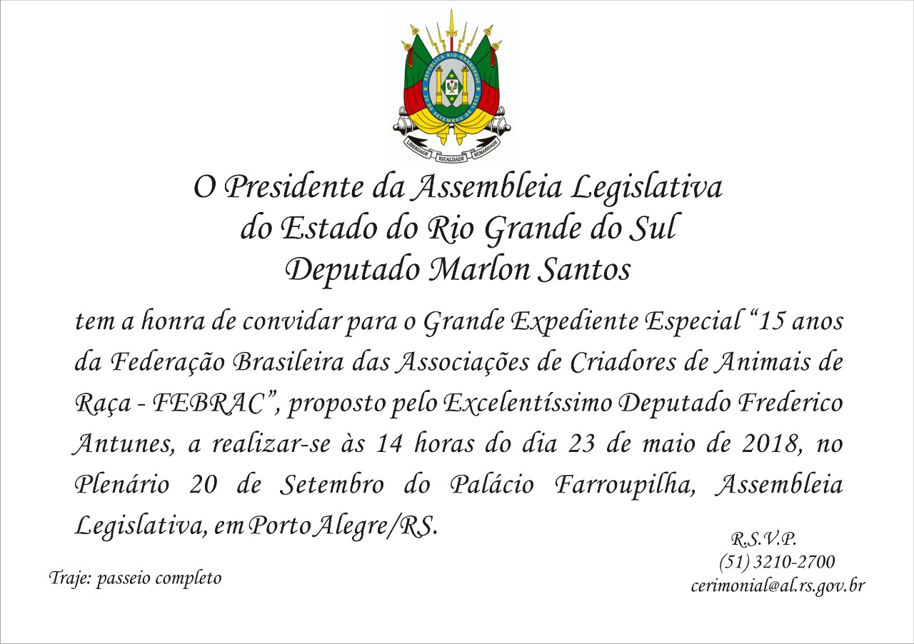 Ementa: O PRESIDENTE DA ASSEMBLEIA LEGISLATIVA DO RS CONVIDA PARA O GRANDE EXPEDIENTE ESPECIAL 15 ANOS DA FEDERAÇÃO BRASILEIRA DAS ASSOCIAÇÕES DE CRIADORES DE ANIMAIS DE RAÇA, DIA 23/05/2018 AS 14H.