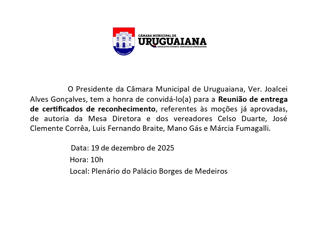 7ª Reunião entrega Certificados da 1ª Sessão Legislativa da 19ª Legislatura